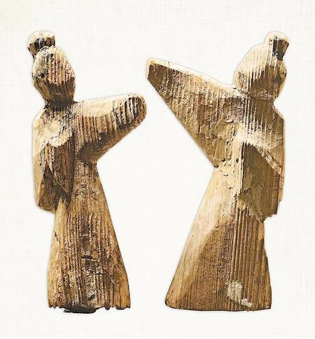 舞俑有獨舞俑和對舞俑兩種組合,舞者主要通過手臂的屈伸表現出舞蹈姿勢。通常先雕出舞俑姿態(tài),然后以白色為底色,用墨線和紅線繪頭發(fā)、衣袖,下垂處呈圓角方形。面部五官基本被省略,主要突出的是動態(tài)的翩翩舞姿。高度通常在20厘米左右。