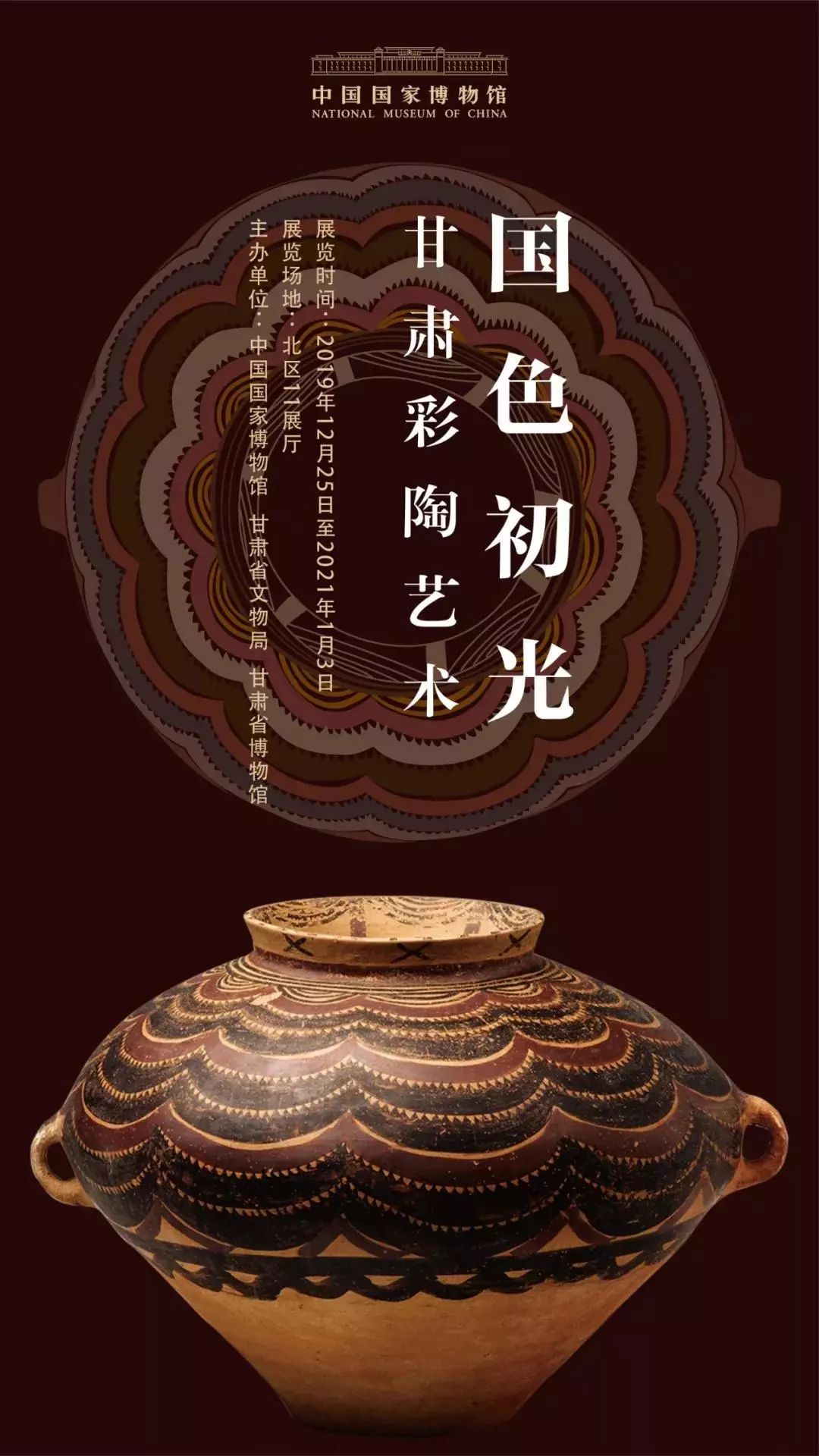 由國(guó)家博物館聯(lián)合甘肅省文物局、甘肅省博物館等十余家文博單位舉辦的“國(guó)色初光——甘肅彩陶藝術(shù)展”于近日在國(guó)家博物館開展,展覽在國(guó)家博物館北11展廳向公眾免費(fèi)開放,將展至2021年1月3日。