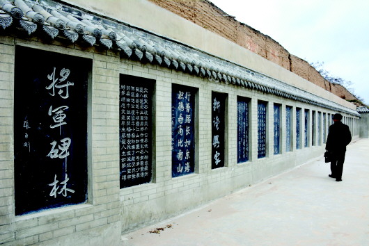 中岔古堡一堡三院,分為前院、中院、后院。走進(jìn)古堡,堡門左側(cè)建有戲樓,上書“中岔劇場”四字。戲樓(又稱戲臺)始建于清光緒年間,上世紀(jì)六七十年代曾重修過。近堡門處右側(cè)堡墻下修建有兩處一體化的石碑長廊一直通向后院,碑廊中石碑一塊接著一塊砌筑在青磚墻內(nèi),石碑與石碑之間以青磚分隔,上覆筒瓦和滴水防護,每一通石碑上都刻有中華人民共和國將軍書寫的一幅書法作品。第一通石碑上甘谷籍將軍張臣剛書寫的“將軍碑林”四字分外醒目,劉精松、邢世忠、裴懷亮、李乾元等數(shù)十位叱咤風(fēng)云的共和國將軍書寫的書法碑刻依次嵌進(jìn)墻內(nèi),組成一個氣勢磅礴、雄偉壯觀的將軍書法長廊,這就是新建的將軍碑林。