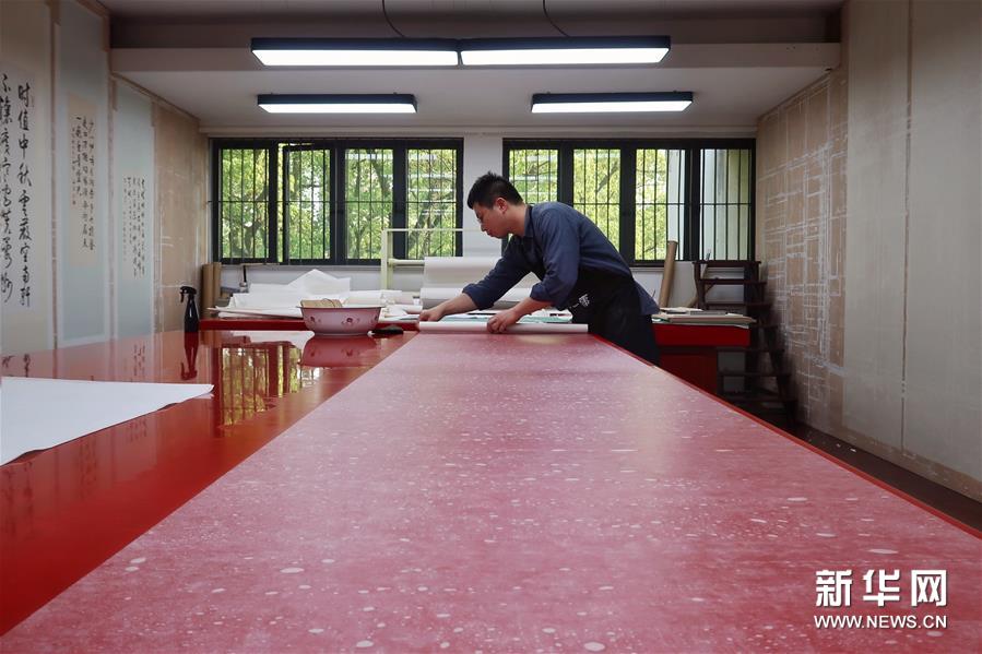 5月13日,古籍修復師在對書畫作品進行裝裱操作。