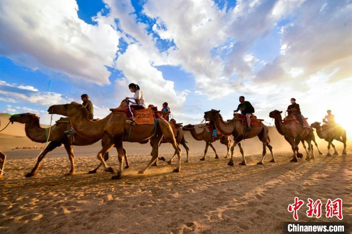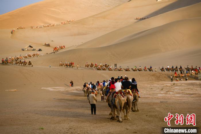 圖為游客騎駱駝暢游鳴沙山?!⊥醣筱y 攝