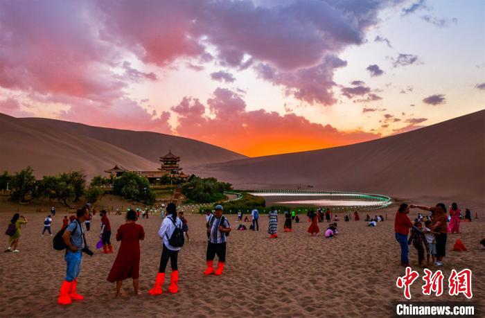 圖為游客觀賞月牙泉晚霞美景。 王斌銀 攝