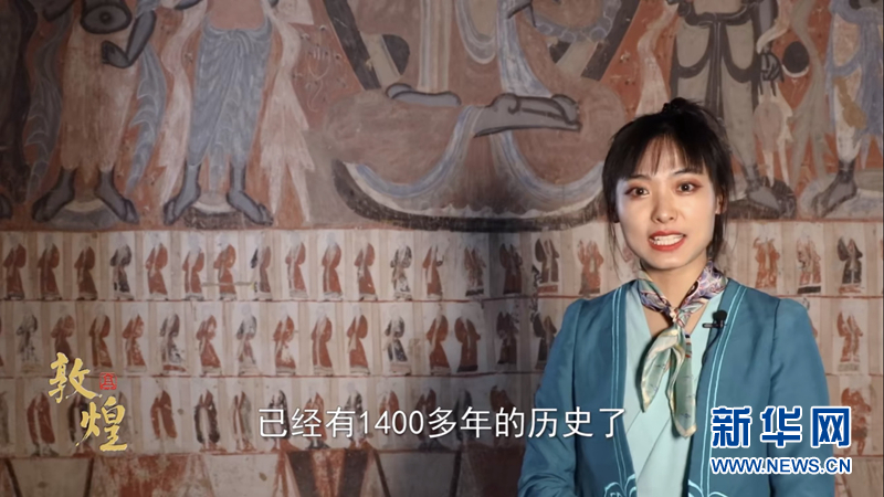 “‘敦煌仿妝’好了,我們一起去看看壁畫原作吧!”鏡頭一轉,班銳從美妝博主成了穿著工作服的講解員。