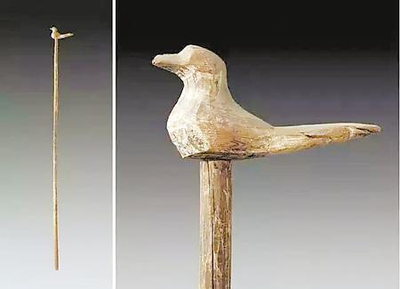 2003年春,江蘇省連云港市博物館在中云鄉(xiāng)華蓋山發(fā)掘一座西漢古墓中,除其他文物外,有一柄杖桿長2米、頂端雕刻有精美的木斑鳩(鳩高10厘米)的鳩杖令人矚目。
