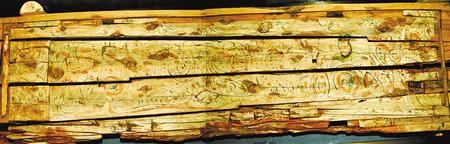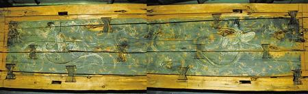 1998年新城魏晉南墓出土。這副完整的木棺由棺身和棺蓋組成,棺蓋內(nèi)側(cè)有一長(zhǎng)方形凹面,內(nèi)彩繪伏羲女?huà)z圖。伏羲女?huà)z人首蛇身,兩尾相交,伏羲在右,左手執(zhí)矩,女?huà)z在左,右手執(zhí)規(guī)。伏羲女?huà)z周?chē)椩茪饧y。棺身呈長(zhǎng)方體,兩檔頭用墨線勾畫(huà)星象圖,棺內(nèi)側(cè)四壁彩繪幃帳、絹帛、蠶繭等圖形。