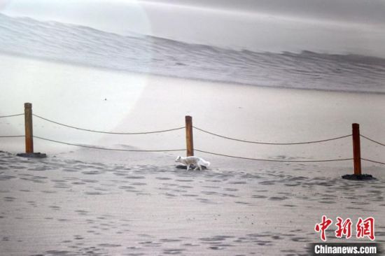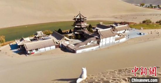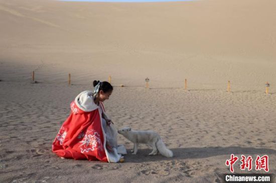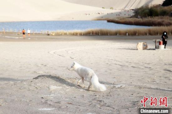 小白狐“打卡”甘肅敦煌鳴沙山月牙泉景區(qū)