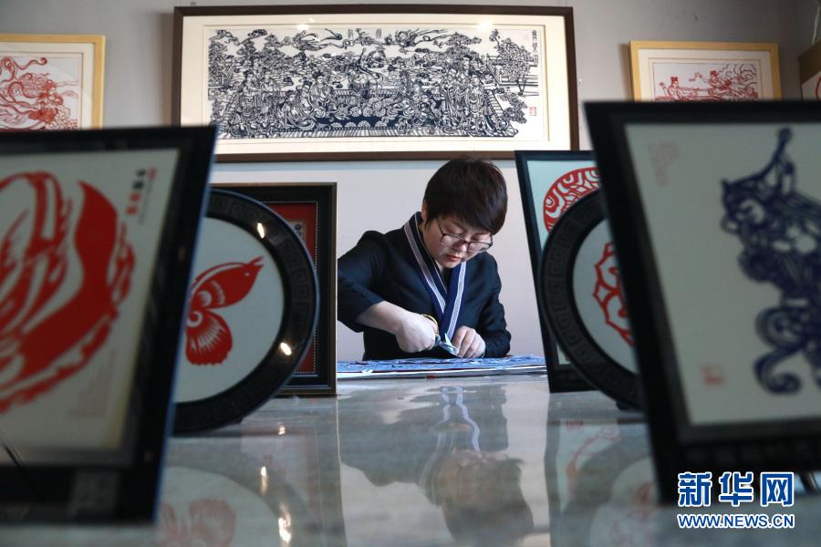 在甘肅敦煌小鎮(zhèn)鳴沙書院,“敦煌剪紙”酒泉市級非物質文化遺產代表性傳承人莊生娟在自己的工作室內創(chuàng)作(2020年12月31日攝)。新華社發(fā)(張曉亮 攝)