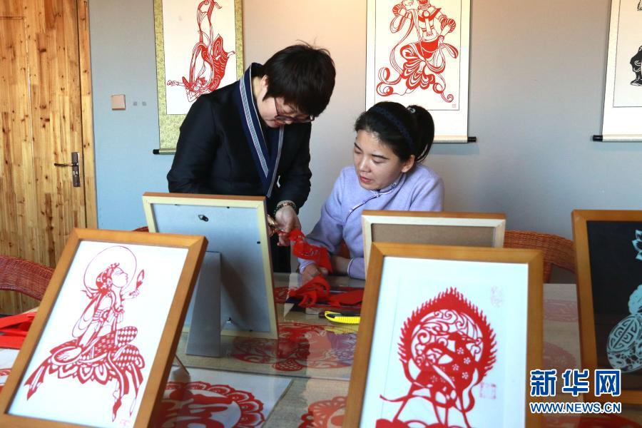 在甘肅敦煌小鎮(zhèn)鳴沙書院,“敦煌剪紙”酒泉市級非物質文化遺產代表性傳承人莊生娟(左)在自己的工作室內指導學員剪紙(2020年12月31日攝)。新華社發(fā)(張曉亮 攝)