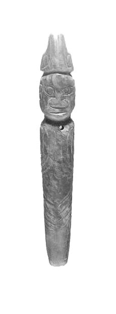 另一件出土于白草坡2號墓的玉人則有所不同,高7.9厘米,黃綠色玉,立像,無足。頭戴高冠,廣額巨目,身似著袍服,身體下方三分之二處有四條刻紋,似被捆綁四肢狀,胸部有一穿孔,或可佩戴。這個(gè)玉人和玉人形鏟有關(guān)系嗎?摘掉頭上戴的高冠,會不會也盤有虎首蛇身發(fā)髻?我們無從得知。