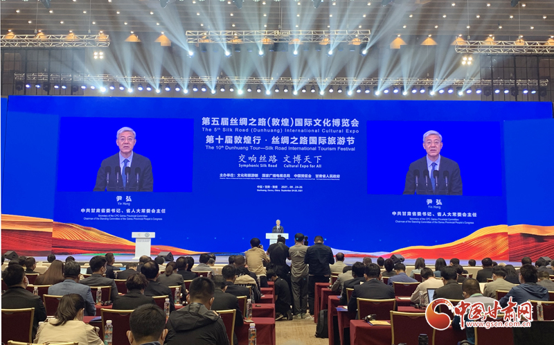 中國甘肅網(wǎng)9月24日訊(本網(wǎng)記者  宋芳科 楊亞楠 張振國)9月24日上午,第五屆絲綢之路(敦煌)國際文化博覽會和第十屆敦煌行·絲綢之路國際旅游節(jié)開幕。本屆“一會一節(jié)”由文化和旅游部、國家廣播電視總局、中國國際貿(mào)易促進(jìn)委員會、甘肅省人民政府共同主辦,以“交響絲路 文博天下”為主題,旨在進(jìn)一步加強(qiáng)“一帶一路”人文交流的官方合作和民間往來,增進(jìn)共建“一帶一路”國家的文化認(rèn)同。中共中央政治局委員、中央書記處書記、中宣部部長黃坤明以視頻方式發(fā)表主旨演講。