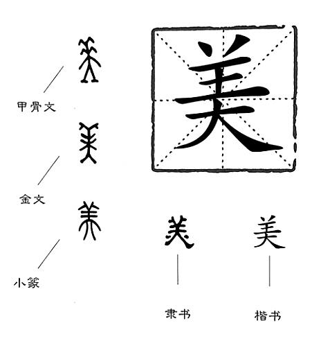 但是,從字源上看,“美”似乎不是一只羊,而是一個(gè)人。“美”初見于商代甲骨文,在甲骨文中,“美”不是會(huì)意字,而是象形字,它的古字形像一個(gè)戴著頭飾站得端端正正的人。一個(gè)人若頭上裝飾著高聳彎曲的羽毛或類似的頭飾物,是不是很美呢?本來遠(yuǎn)古時(shí)的先民喜歡在頭上插上橫七豎八的頭飾,再聯(lián)想一下印第安酋長(zhǎng)頭上那頂裝飾著長(zhǎng)長(zhǎng)羽毛的發(fā)冠,“美”的甲骨文字形簡(jiǎn)直就是印第安酋長(zhǎng)的簡(jiǎn)筆畫。