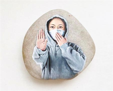 現在,馬玉蘭已完全掌握了“石畫”的技巧,跟隨石頭的形狀走勢設計畫面,利用凸出的部分打造光澤感,落筆時精準控制力度,她將疫情之下平凡人的神韻生動地體現在每一次運筆中。