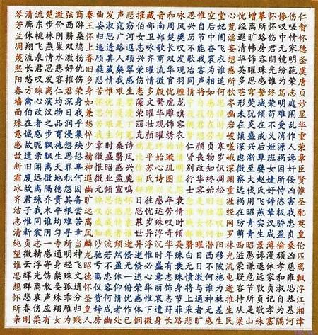 蘇蕙《璇璣圖》不僅是一束厚重的文學(xué)奇葩,也是一幅充滿(mǎn)創(chuàng)意的藝術(shù)巨制。她將詩(shī)歌的載體從傳統(tǒng)簡(jiǎn)帛紙張轉(zhuǎn)換成為錦。錦是有彩色花紋的高級(jí)絲織品。以錦為書(shū)寫(xiě)材料制作《璇璣圖》,除詩(shī)歌本身的創(chuàng)作外,首先需要染絲紡織。錦織好后,又要對(duì)《璇璣圖》謀篇布局,劃區(qū)設(shè)色,書(shū)詩(shī)于錦,然后一針一針地將它繡出來(lái),變?yōu)榛匚腻\字。那每一道工序,要求都極精細(xì),不得有半點(diǎn)疏忽,不然就會(huì)留下污點(diǎn)和遺憾。蘇蕙集眾藝于一身,完美地將其制作出來(lái),體現(xiàn)了她的綜合藝術(shù)才能。取名“璇璣(泛指北斗)圖”,寓意它像北斗,可以旋轉(zhuǎn)地讀。它是在華美的錦上,又以五彩繽紛的絲線繡上《璇璣圖》,不僅顏色更加艷麗,而且那841個(gè)金玉珠璣般文字,展現(xiàn)的令人眼花繚亂的詩(shī)歌園地,更是前不見(jiàn)古人,后不見(jiàn)來(lái)者,比錦繡的光彩更加耀眼奪目。