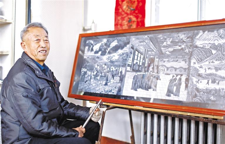 接下來就是耗費工時與體力的制作過程,“每天創(chuàng)作雕刻都在三四個小時,每分鐘在刻板的敲擊次數(shù)達到近200次,每小時敲擊次數(shù)達到8000-12000次,9大板塊在創(chuàng)作過程中就要敲擊近16億次點,每個板塊耗時10-11個月,9大板塊共耗時3000多天。”陶世清細(xì)數(shù)著創(chuàng)作的艱辛。