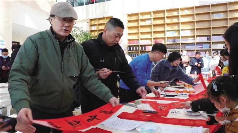 活動(dòng)中,蘭州畫院和市文化館的10余位書畫家提筆蘸墨、盡情揮毫,為新區(qū)圖書館精心創(chuàng)作了美術(shù)作品,并為聞?dòng)嵹s來的眾多新區(qū)居民現(xiàn)場書寫了寓意吉祥的春聯(lián)和“福”字近400套(幅),在春節(jié)來臨之際為他們送上了美好的祝愿。