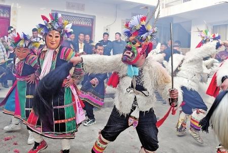 文縣鐵樓鄉(xiāng)麥貢山村,當(dāng)?shù)鼐幼〉臇|亞最古老部族白馬藏族用自己獨(dú)特的民俗——跳“池哥晝”,歡度元宵佳節(jié)。