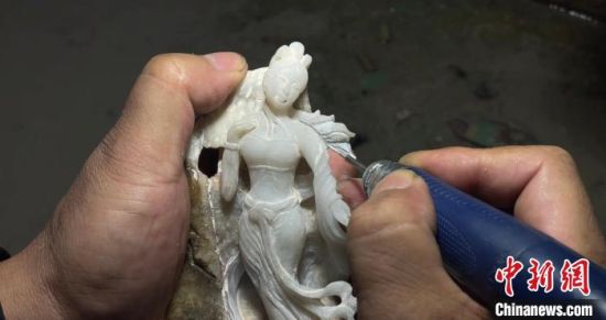 圖為玉雕手藝人李學(xué)平正在進(jìn)行飛天人物的雕刻?!「攥?nbsp;攝
