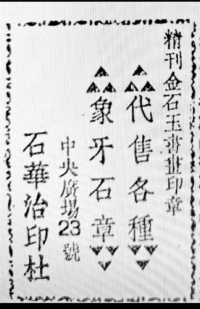 最后要提到的一則廣告也與文化有關(guān)。蘭州和平日?qǐng)?bào)社1947年出版的《新蘭州》一書(shū)中,曾刊登石華治印社廣告,其廣告詞曰:“精刊金石玉書(shū)畫(huà)印章、代售各種象牙石章”,社址在中央廣場(chǎng)23號(hào),其創(chuàng)辦者即為隴右印壇名宿駱石華先生。駱石華先生1920年生人,彼時(shí)未及而立,尚未入白石先生門(mén)下;筆者家外祖解放前供職中央廣場(chǎng)郵局,當(dāng)年曾與石華先生相交。今偶于舊籍中覓得石華治印社當(dāng)年廣告,恭錄于此,既為本文收尾,亦為家外祖與石華先生半個(gè)世紀(jì)友誼之緬懷。