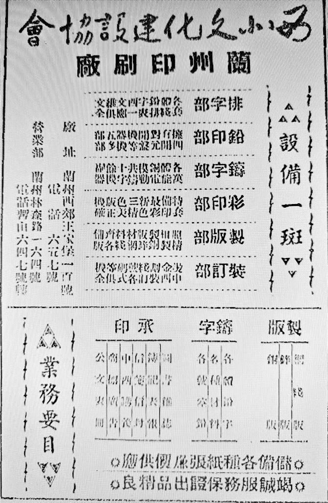 個(gè)別有實(shí)力的印刷廠(chǎng)也通過(guò)廣告拓展業(yè)務(wù)。如創(chuàng)辦于1947年9月的西北文化建設(shè)協(xié)會(huì)蘭州印刷廠(chǎng)是當(dāng)時(shí)甘肅規(guī)模較大的印刷廠(chǎng)之一,曾印制過(guò)《蘭州古今注》《花兒集》《西北論叢》《新光》等書(shū)刊。據(jù)當(dāng)年廣告所載,該廠(chǎng)內(nèi)設(shè)排字部、鉛印部、鑄字部、彩印部、制版部、裝訂部,承印范圍亦頗廣,包括圖書(shū)雜志、傳記表報(bào)、信箋信封、中西講義、商標(biāo)廣告、公文表格等。