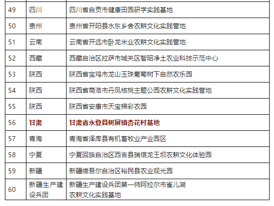 日前,農業(yè)農村部、共青團中央、全國少工委組織開展了農耕文化實踐營地推薦工作。經(jīng)過逐級推薦、材料審查、專家評審和網(wǎng)上公示,全國農業(yè)展覽館(中國農業(yè)博物館)等60個單位為農耕文化實踐營地,甘肅省永登縣樹屏鎮(zhèn)杏花村基地入選。