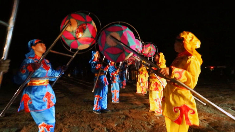 景泰滾燈由燈籠和燈架組成,燈籠分里外兩層,為圓形,外層轉(zhuǎn)動(dòng)內(nèi)層固定,燈籠外層用彩紙或紗綢裱糊。表演者手執(zhí)燈架,輕輕一碰地面,燈籠便轉(zhuǎn)動(dòng)起來(lái)。夜晚,彩燈滾動(dòng),猶若五彩斑斕的長(zhǎng)龍,扭曲躍動(dòng),時(shí)慢時(shí)快,回頭擺尾往復(fù)盤(pán)旋,交響輝映,別有一番情趣。