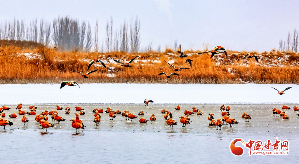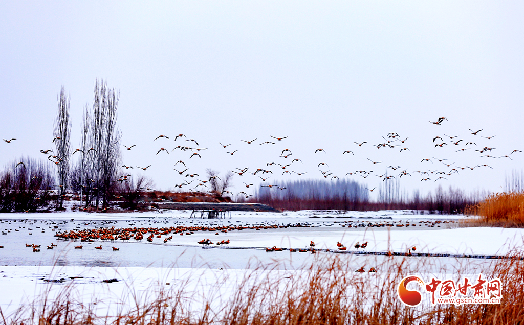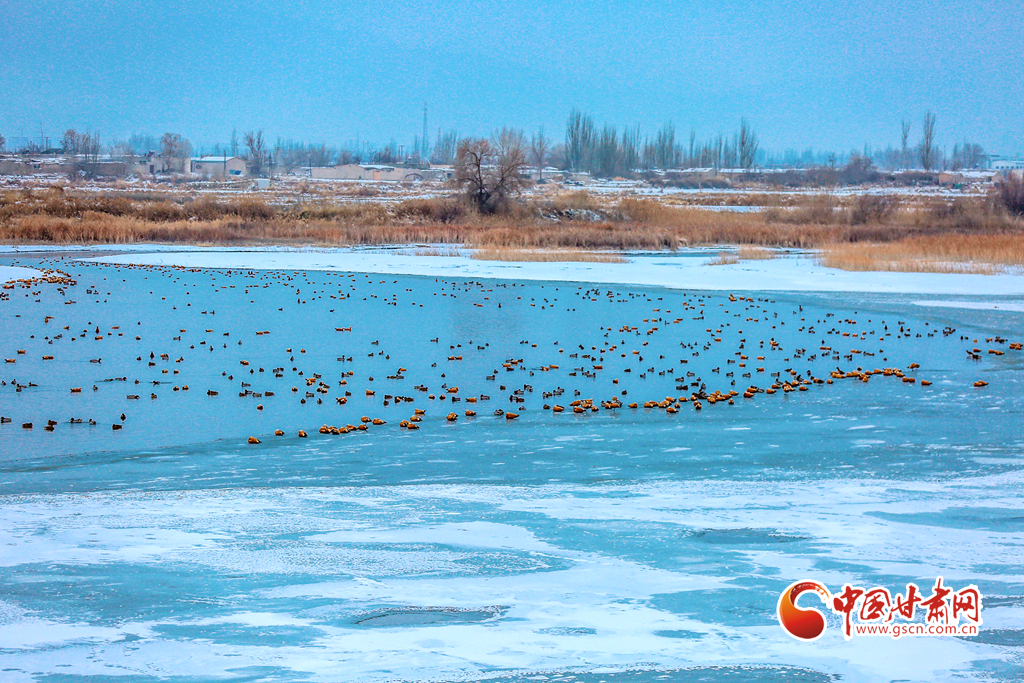 12月20日,在甘肅省酒泉市銀達(dá)鎮(zhèn)花園水庫(kù),一群候鳥正在戲水、覓食,為祁連山下的戈壁大地增添了一道亮麗的景色。