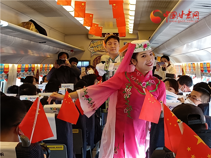 飛天與花兒相擁,甘肅與寧夏直通。蘭銀高鐵中蘭段開(kāi)通,也讓銀蘭高鐵全線貫通。為了慶祝這一歷史時(shí)刻,D9058次列車乘務(wù)組準(zhǔn)備了精彩的節(jié)日?!痘▋号c少年》展演寧夏風(fēng)情,遇見(jiàn)塞上花開(kāi)。敦煌樂(lè)舞,充滿甘肅元素講述飛天故事,巧妙的節(jié)目安排生動(dòng)地展示了甘肅、寧夏兩省區(qū)的文化元素,讓旅途不僅有一路風(fēng)光,更有一路風(fēng)情。