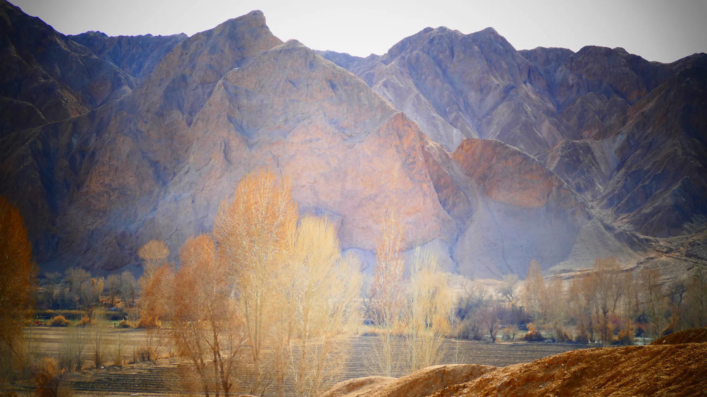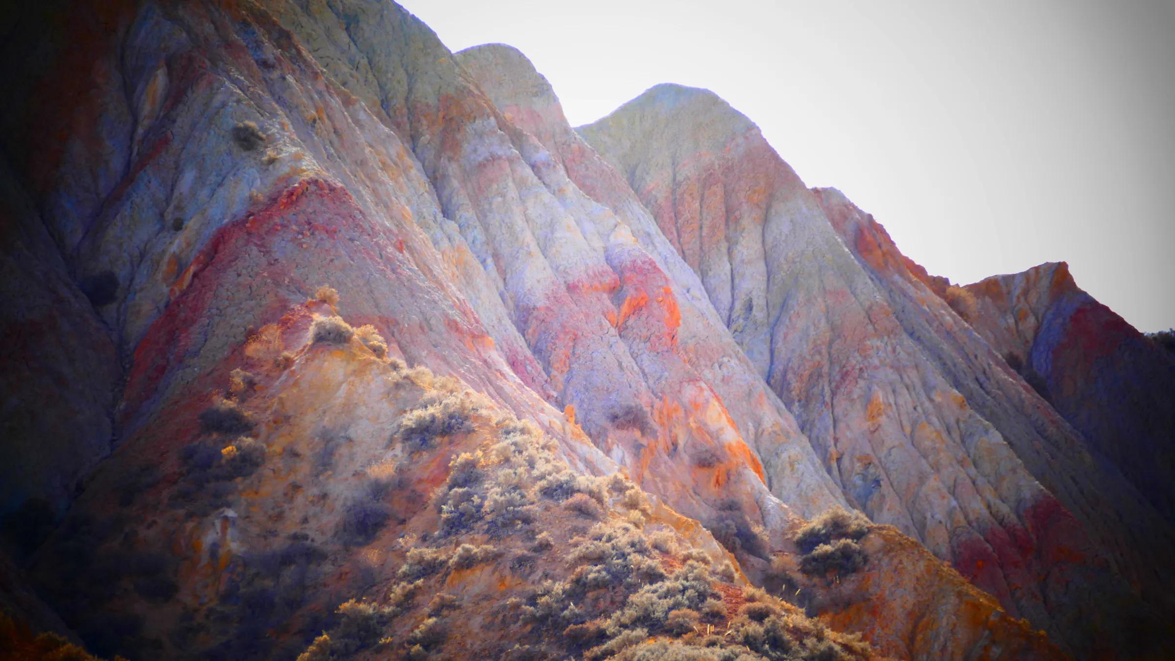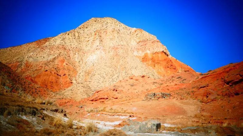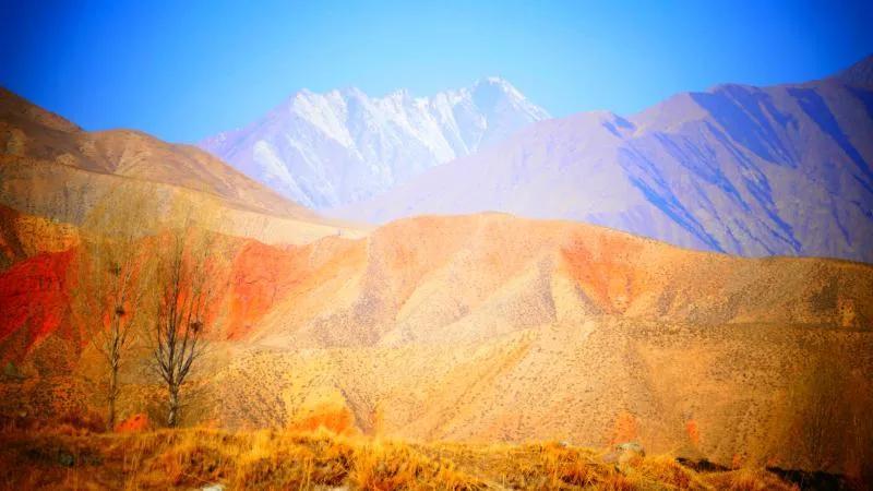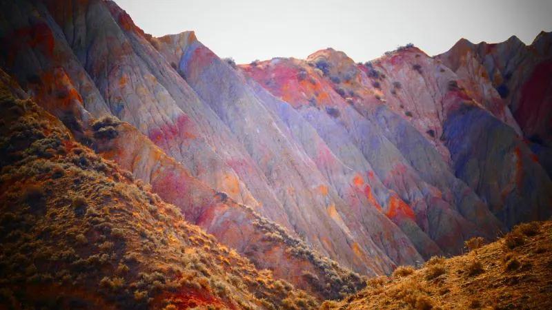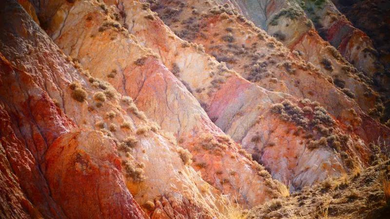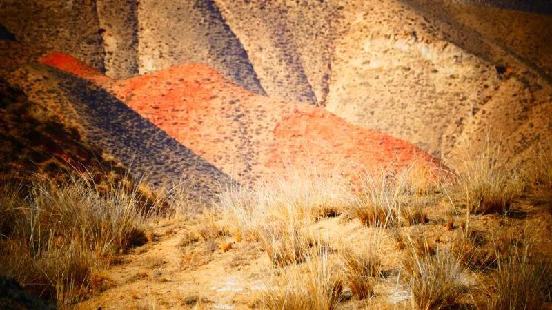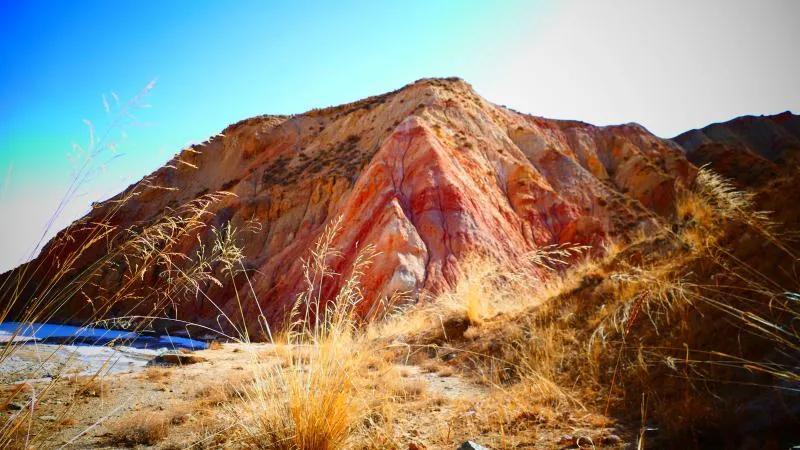 從馬營河大峽谷南端再向南一眼望去就是祁連雪山,沿著河道通過高臺縣新壩鎮(zhèn)的紅沙河村,向東南走進祁連山脈可見一片五顏六色的奇觀,又一個丹霞地貌在祁連山展現,可稱高臺“小泉丹霞〞。據說這個“丹霞”還沒有媒體“曝過光〞。