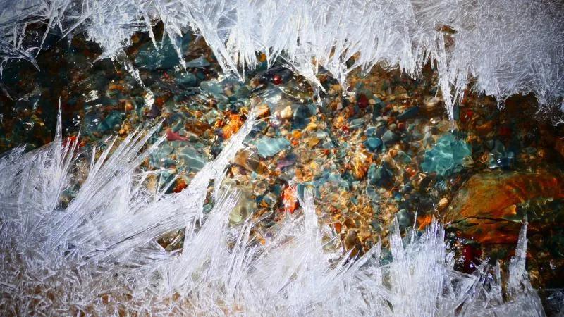 在丹霞山間可見一條冰凍似凍的水溪,系小泉河支流,在陽光下透過像東北冬天窗花一樣的冰花,可看見水下的鵝卵彩石,望遠看去小溪像一條披上雪衣的彩龍。