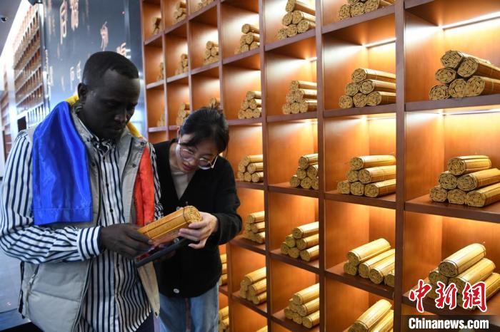 圖為游客在大漢賦館內(nèi)體驗閱讀漢簡(復制品)。 戴文昌 攝