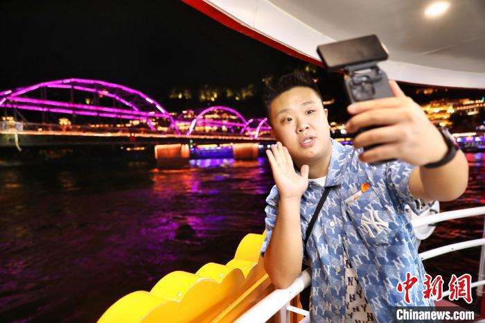 7月16日,“絲路風采 如意甘肅”海峽兩岸記者聯(lián)合采訪活動在甘肅蘭州啟動。圖為臺灣自媒體人林惟綱在“黃河第一橋”——中山橋下拍攝短視頻?!≈行律缬浾?nbsp;李雪峰 攝