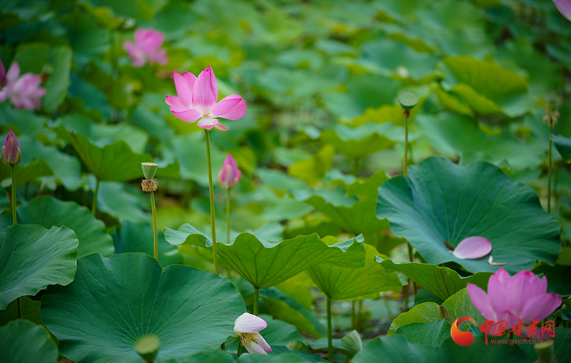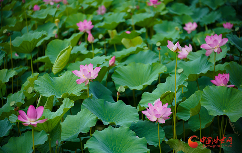 盛夏時(shí)節(jié),甘肅成縣裴公湖的荷花爭(zhēng)相盛開(kāi),吸引大批游客前來(lái)觀賞,拍照打卡。