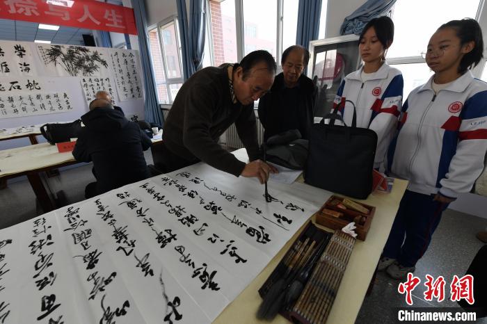 圖為書(shū)法家在蘭州交通大學(xué)附屬中學(xué)現(xiàn)場(chǎng)書(shū)法交流。戴文昌 攝