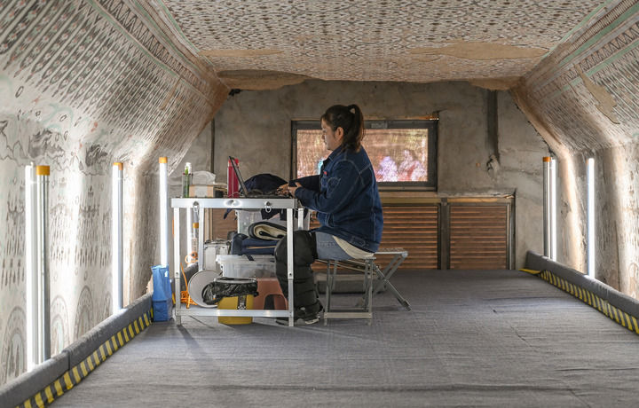 2023年8月3日,在敦煌莫高窟正在保護修繕的第55窟內,一位文保工作者對采集的數據進行整理。新華每日電訊記者 李賀 攝
