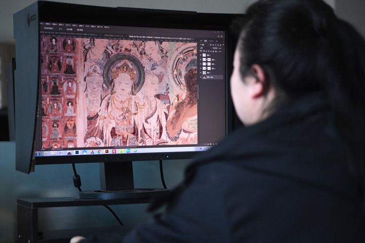 2023年4月25日,敦煌研究院文物數字化保護團隊圖像處理人員年海麗在拼接壁畫圖像。 新華每日電訊記者 陳斌 攝