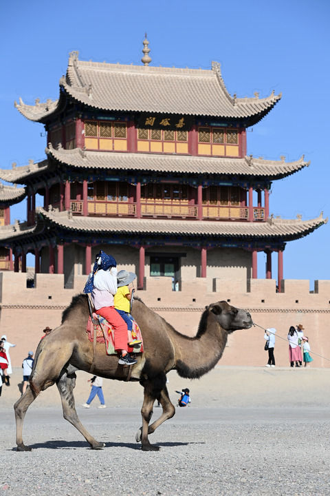 2023年8月7日,游客在嘉峪關關城外騎駱駝。 新華每日電訊記者 范培珅 攝