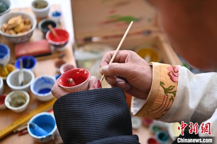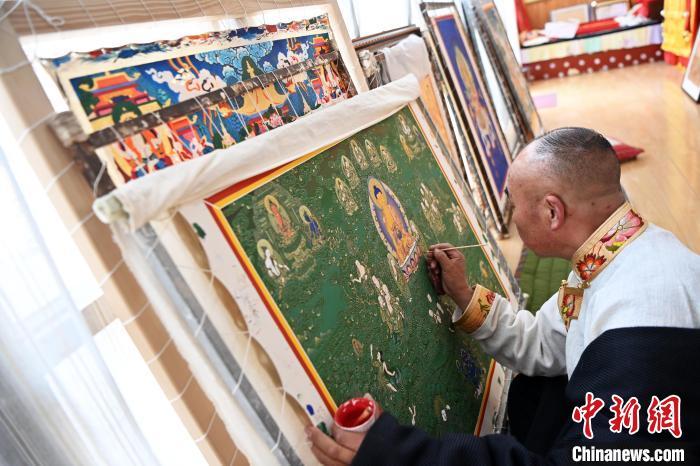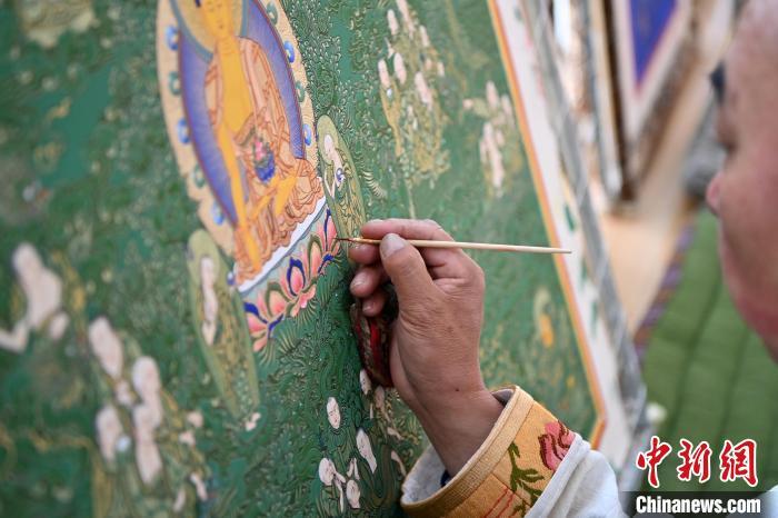 圖為交巴加布在個人工作室內(nèi)給唐卡上色。一幅精美的唐卡作品,需要耗費畫師幾個月甚至幾年時間。從勾線到著色,每一步、每一筆都要屏息凝神。九美旦增 攝