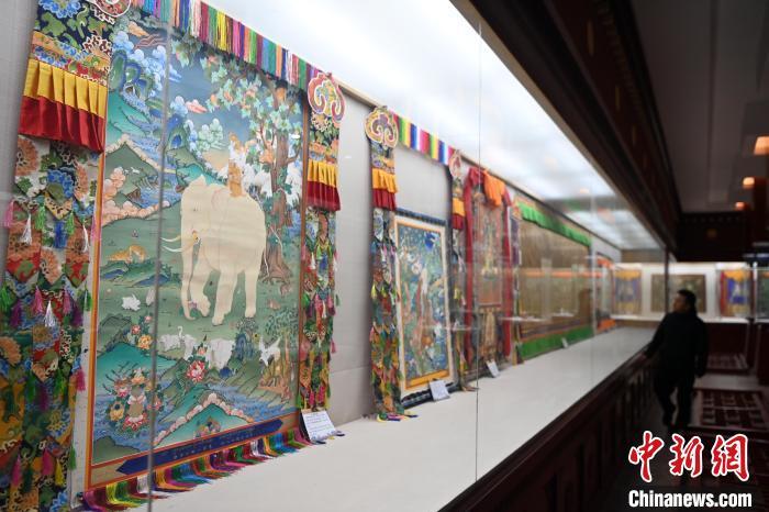 圖為精品唐卡展廳內(nèi)展出的交巴加布與父親的唐卡作品,常吸引游人“打卡”。九美旦增 攝
