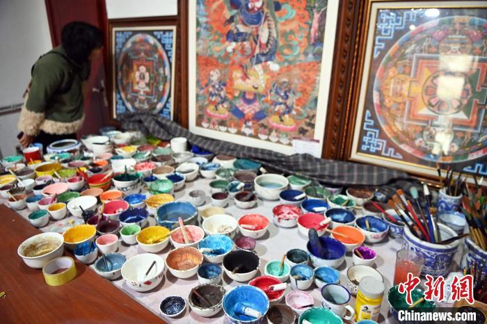 圖為唐卡小鎮(zhèn)一畫室內(nèi)擺出大大小小已完成的唐卡和各色顏料。唐卡具有鮮明的民族特點和獨特的藝術(shù)風(fēng)格,采用金、銀、珍珠、瑪瑙、珊瑚、松石、孔雀石、朱砂等珍貴的礦物寶石和藏紅花、大黃、藍(lán)靛等植物為顏料。九美旦增 攝