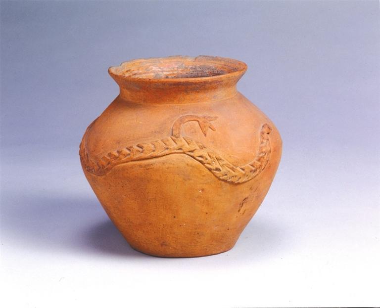 這條龍,是采用凸堆手法雕塑于一件無耳、束頸紅陶罐之上,它出土于臨夏廣河縣齊家坪遺址。別看它貌不驚人,和眾多同時(shí)期出土的陶罐也無二致,但它卻是一件國家一級文物。