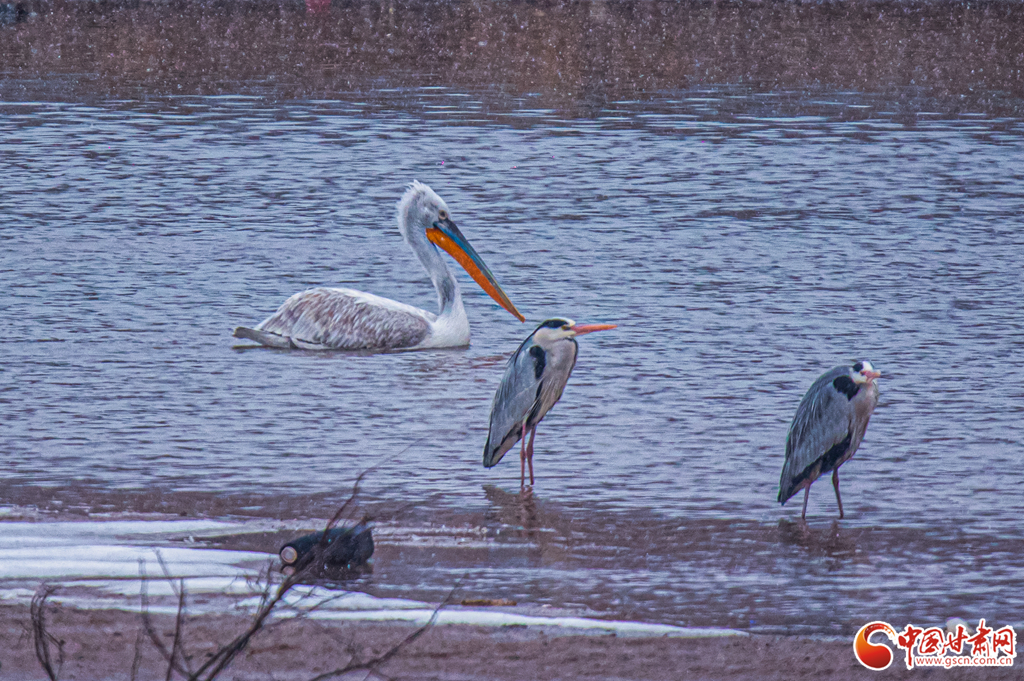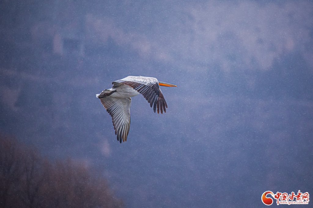 當(dāng)天,天空下著大雪,天氣寒冷,一位野生鳥(niǎo)類攝影愛(ài)好者驚喜地在崇信縣汭河段發(fā)現(xiàn)了一只卷羽鵜鶘盤旋于河道上空,經(jīng)過(guò)跟蹤其降落于發(fā)現(xiàn)地20里外的銅城水庫(kù)附近水域,與蒼鷺混群。