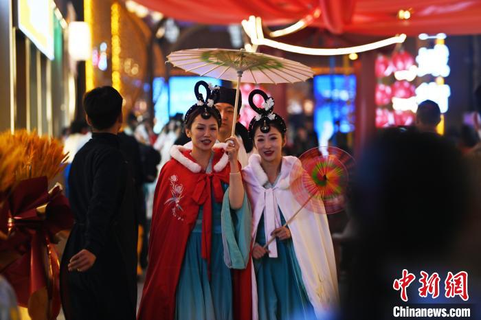 3月22日晚,甘肅省蘭州市黃河食渡文旅美食街內(nèi),街區(qū)人員著傳統(tǒng)服飾游園。李亞龍 攝