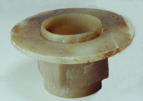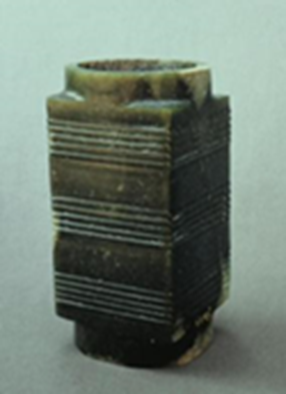 玉琮(編號總0128:1)高4~4.2厘米,外方邊長6.1~6.3厘米,內(nèi)徑5.2厘米,上端射較長,下端射極短,形制原始古樸,切割改制的現(xiàn)象明顯。