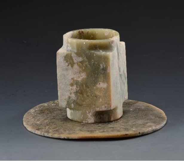 胡家底遺址發(fā)現(xiàn)的三對玉璧和玉琮,每對材質(zhì)基本相同,玉璧中孔可套疊在琮之射端,可見當年有可能套疊使用以祭祀天地。