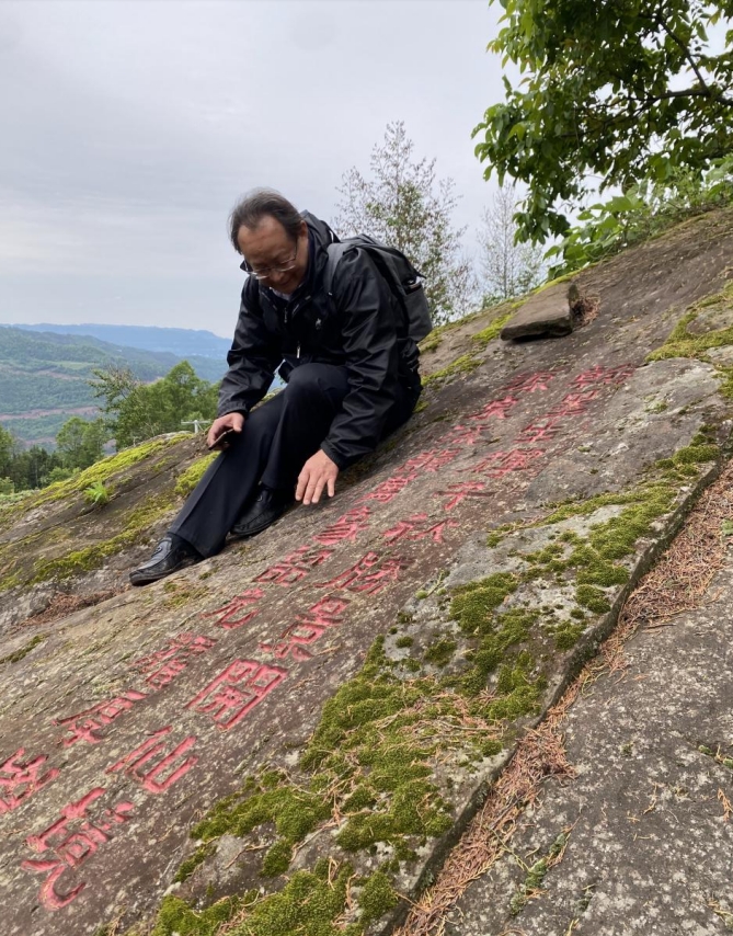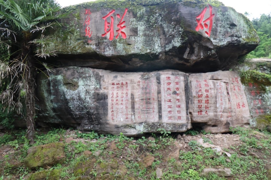山上隨處是石,或臥或立,俱有雄獅虎豹之勢;或平或峻,皆作岡陵之態(tài)。青峰續(xù)脈,絕頂鷹飛。鑿巖壁以造法像,栩栩如臨宮闕;摩巨石而鐫嘉聯(lián),文華直射牛斗。石多瑰偉,苔覆璞瑜,油菜花點綴其間,引來蜜蜂蝴蝶共舞。山茶與毛竹同畦,郁郁蔥蔥;峰巒與云煙共養(yǎng),莽莽蒼蒼。遇目石上鐫字,瀏賞翰墨煙霞;振藻揚毫,皆寰中俊杰;椽筆斯文,多隴蜀賢達?;虺嘧痈文懀瑺T照于史;或凜然浩氣,嘯傲大千。聯(lián)壁生輝,文曲星彰;峣巖開竅,氣通神明。文采煥然與星河同輝,詩儕競秀潤厚山玉顏。壯懷詩夢,漱玉溪流。在一塊巨石斜面上,有同伴發(fā)現(xiàn)刻有筆者所書長聯(lián),興奮得喊叫起來。這是三年前應(yīng)曹興章先生之約而作,聯(lián)曰:翰墨生輝,千秋勝景開仙境;源泉流韻,萬象韶光耀厚山。我用手指扣去筆畫生出的茂密青苔,坐下來與我的聯(lián)合影留念。信是蓮花開石上,遙遙至此結(jié)仙緣。