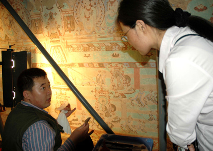 為了讓游客了解世界文化遺產敦煌莫高窟的壁畫保存現(xiàn)狀、保護原則、保護方式,提高公眾對莫高窟文物的保護意識,2008年6月以來,敦煌莫高窟壁畫保護修復現(xiàn)場每周定期向游客開放。圖為2008年9月22日,在莫高窟98窟內,敦煌研究院保護人員(左)正在向一名游客講解如何修復壁畫。新華社記者王艷明攝