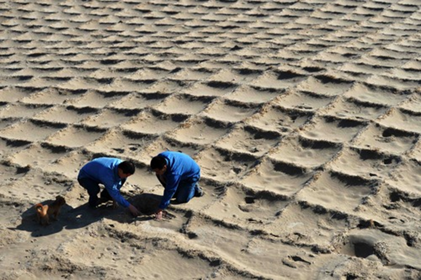 記者從敦煌研究院了解到,到2014年,經過70年持續(xù)風沙治理,風沙對敦煌莫高窟的危害顯著降低,進入窟區(qū)年積沙量減少85%以上。據敦煌研究院保護所副所長汪萬福介紹,在幾代治沙人的努力下,莫高窟頂已形成由防沙障阻沙、沙生植物林帶擋沙、麥草方格沙障固沙和礫石壓沙組成的風沙防治綜合體系,極大減緩了風沙對敦煌壁畫和塑像等文物的危害,改善了窟區(qū)生態(tài)環(huán)境。圖為2014年8月29日,兩名工作人員檢查用于固沙的麥草方格。新華社記者陳斌攝