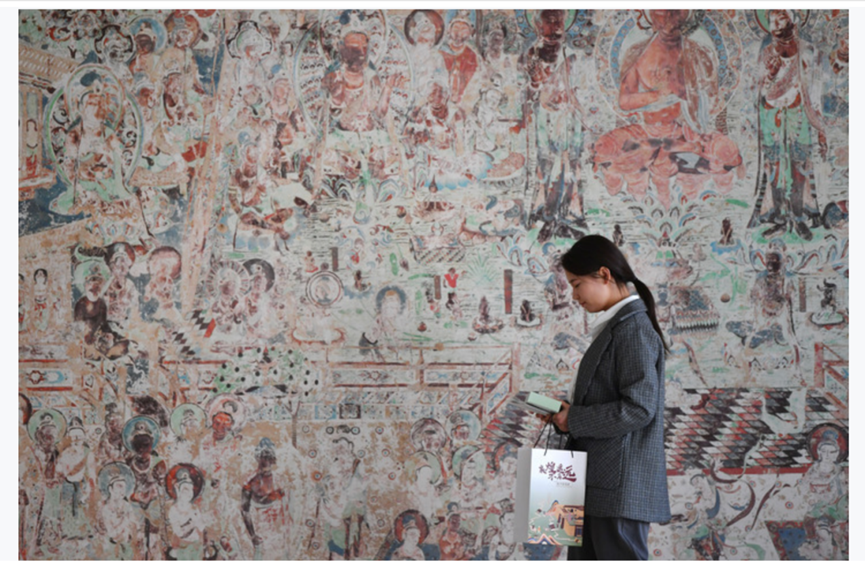 圖為敦煌研究院文物數字化保護團隊創(chuàng)意營銷人員廖雪婷從一幅高保真復制壁畫前走過(2023年4月25日攝)。新華社記者陳斌攝