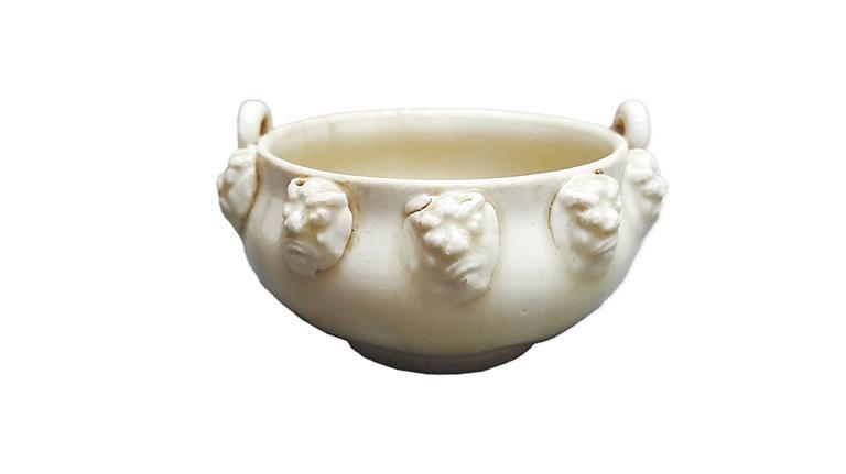 胎白質(zhì)細(xì),內(nèi)外垂?jié){淚痕處閃青,足底無(wú)釉,采用模印和堆貼技法。大口短頸,鼓腹內(nèi)收,口外附二個(gè)對(duì)稱(chēng)的環(huán)形耳,耳根部飾三個(gè)鉚釘形圓餅,兩耳間各貼五個(gè)怒目圓睜的頭面像。