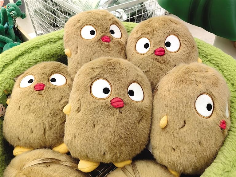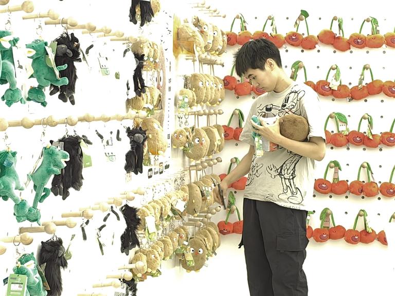 此時(shí),目不暇接的花式文創(chuàng)在店內(nèi)“爭奇斗艷”,爭當(dāng)“顯眼包”,等待被主人帶回家。掀開店內(nèi)一只毛絨收納箱,一窩土豆子撲閃著大眼睛向你眨眼。都說轉(zhuǎn)角遇到愛,誰料,轉(zhuǎn)角處粉嘟嘟的“拿捏玩偶娃娃公仔”捏著一個(gè)小蓮花花苞在向你招手。一回頭,造型別致的文創(chuàng)飾品精美又時(shí)尚,一側(cè)的帆布包上印著“別卷我”。就連記者逛下來,都入手兩件文創(chuàng)。